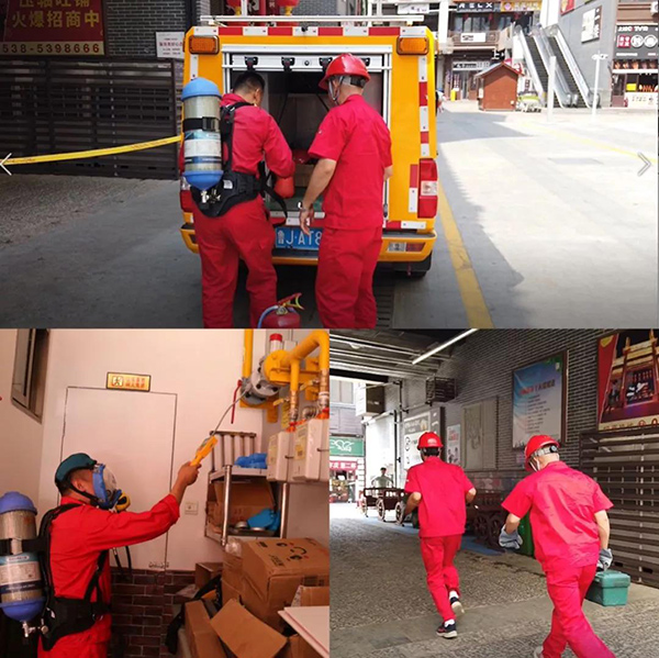 “演練開始!”當(dāng)天14:30,隨著應(yīng)急總指揮泰山玻纖黨委委員、副總經(jīng)理、安泰燃?xì)舛麻L趙恒剛的一聲令下,燃?xì)馐鹿蕬?yīng)急演練正式開始。泰安老街中心街商戶燃?xì)鈭?bào)警器突然報(bào)警,店內(nèi)工作人員聞到燃?xì)鈿馕叮⒓聪蚶辖稚坦芊?wù)中心和安泰燃?xì)夤具M(jìn)行報(bào)警。老街商管保安人員接到報(bào)警后立即趕赴現(xiàn)場協(xié)助處置,第一時(shí)間關(guān)閉商業(yè)樓燃?xì)饪傞y,并有序組織商戶及游客緊急撤離。