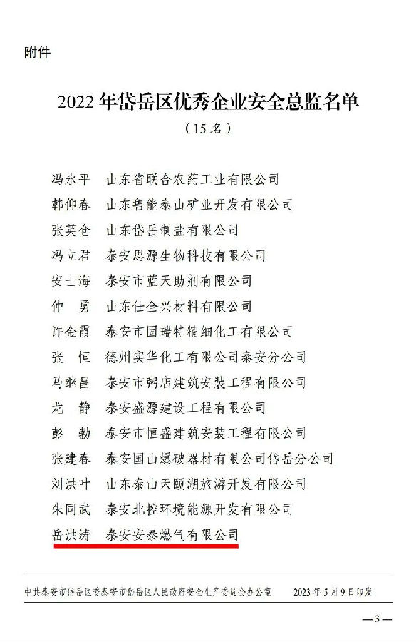 近期,在岱岳區(qū)優(yōu)秀企業(yè)安全總監(jiān)評(píng)選中,安泰燃?xì)夤景踩偙O(jiān)岳洪濤喜獲殊榮。下面請(qǐng)跟小編一同領(lǐng)略榜樣風(fēng)采。