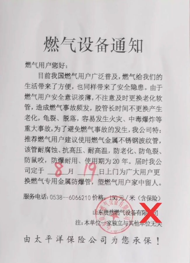 安泰燃?xì)夤驹诖肃嵵芈暶鳎涸谖夜舅爡^(qū)域內(nèi)未開(kāi)展此類業(yè)務(wù),且未委派任何單位開(kāi)展此類業(yè)務(wù)。請(qǐng)廣大燃?xì)庥脩糇屑?xì)辨別,謹(jǐn)防上當(dāng)受騙購(gòu)買不合格產(chǎn)品,影響用氣安全。
